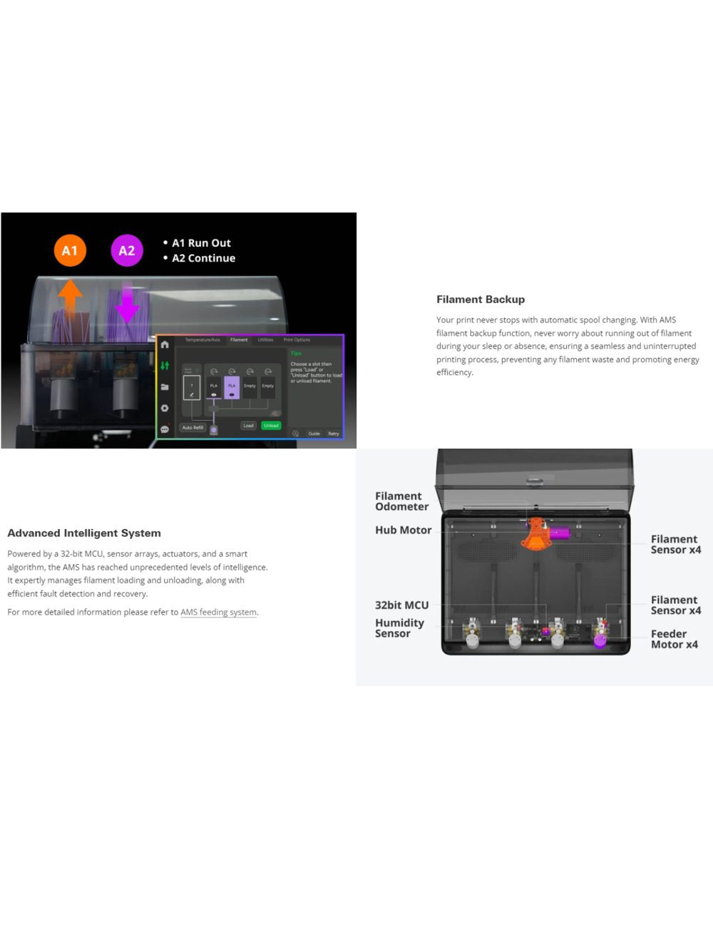 The AMS features a sealed, humidity-controlled enclosure that keeps filaments dry and protected from dust, ensuring consistent printing quality. Intelligent filament detection and automatic switching prevent run-out errors, while smooth feeding mechanisms reduce tangles and jams for reliable performance.