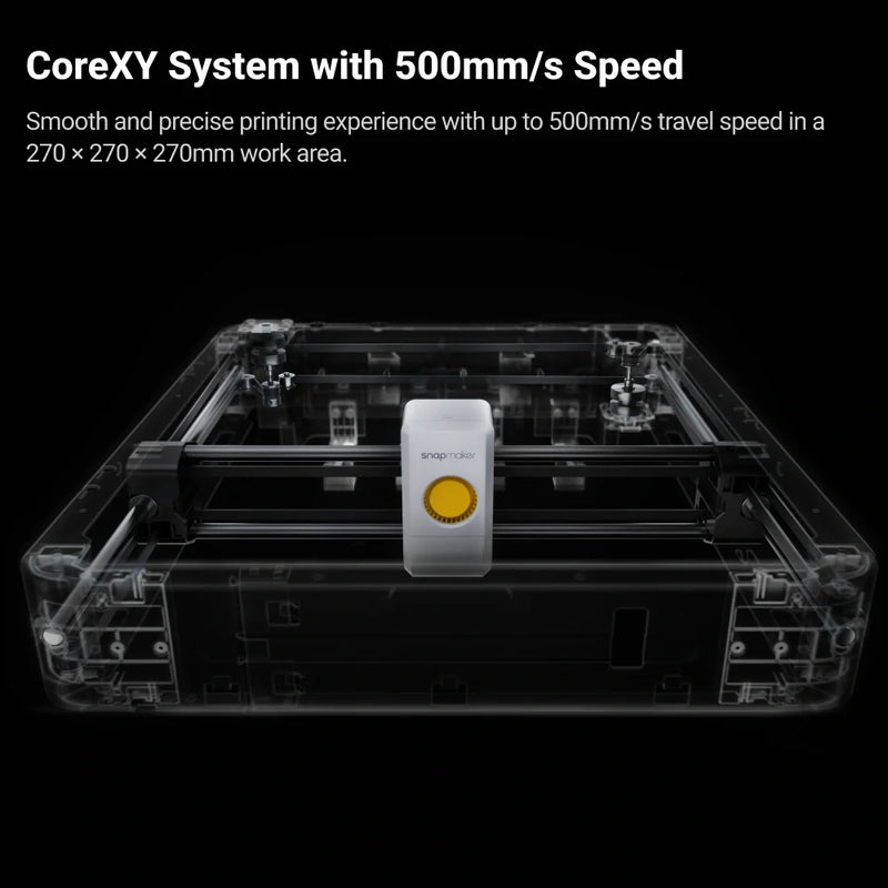 • • CoreXY System with 500mm/s Speed: Lightweight, rigid carbon fiber X-axis rails, delivering travel speeds of up to 500mm/s, and maintaining long-term precision across a 270 × 270 × 270mm work area.